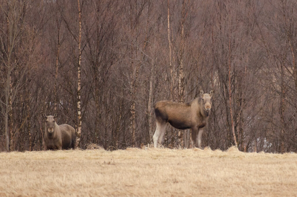 Jour après jour, nous prenons nos marques et les fjords défilent, chacun avec ses particularités et ses couleurs. Je m’entiche tout particulièrement du port de Løkvollen et de ses cabanes de pêche sur lesquelles nichent les Huîtriers pies. Les observations de la faune se succèdent le long de la route, la météo est parfaite et nous tombons même pas hasard sur deux femelles d’élans sur une tourbière ! On remarque leurs traces un peu partout (crottes et empreintes) mais malgré leur taille imposante et la végétation parfois rare, ce sont des bêtes très discrètes qui ne se laissent pas toujours voir.
